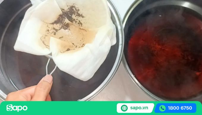 - Bước 3: Dùng rây vớt bỏ bớt xác trà bên trong nồi. Sau đó, dùng lưới/ khăn để lọc lại 1 lần nữa để lọc hết các cặn, vụn trà trong nồi.